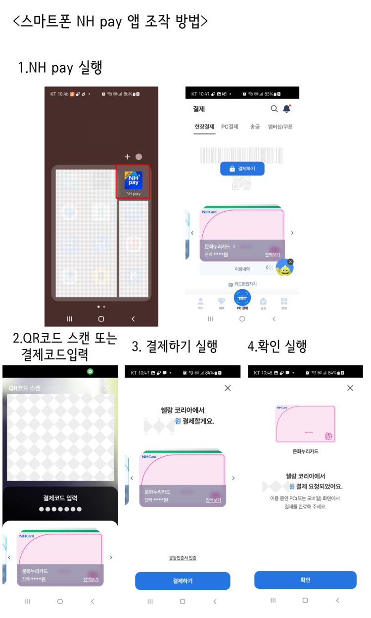 구글 또는 앱스토어에서 NHpay 다운로드 후 NHpqy가입 → 더보기 → 결제 → 결제관리 → 기프트카드 선택 후 문화누리카드 등록